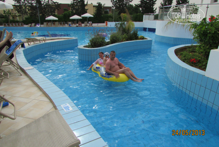 Отель зелёный,много красивых цветов и пальм.Большой бассейн с отделением для детей хорошо прогревается.Через дорогу находится аквапарк.Работает с 10-17ч.Вода в детском бассейне холодная.Корабль горка винтовая и труба,всевозможные брызгалки.6 горок для взрослых.Протекает ленивая речка можно на кругах кататься.