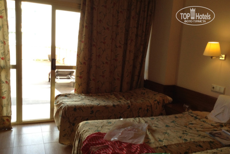 Расположение отеля - удачное во всех отношениях.Разместили нас быстро. Номер 122, на 2 этаже. Вид на море, но видно только маленькую полоску, т.к. второй этаж и другие отели закрывают обзор . Преимущество этого номера: шикарный балкон-веранда размером 25 метров. На веранде 2 лежака, столик, 2 стула. Сам номер стандартный.В номере две взрослых сдвинутых вместе кровати, полноценная кровать для старшего ребенка и кресло кровать для младшего. Стол, стул, тумба, две маленькие прикроватные тумбочки, шкаф-купе. Плоский телевизор (пульт надо взять на рецепции под залог 20 евро), кондиционер, сейф (платный 28 евро в неделю), холодильник. Санузел совмещенный - ванная, душевая кабина, унитаз, биде, раковина, фен. Wi-fi в номере платный ( 20 евро в неделю), но скорость очень хорошая. Шумоизоляция в номере -плохая. Слышно все, что происходит в коридоре и в соседних номерах. Шум с улицы (в том числе от электричек) нас не беспокоил. Кроме одного дня. В предпоследнее воскресенье июня школьники Каталонии отмечают окончание учебного года взрыванием петард (бахали все ночь).