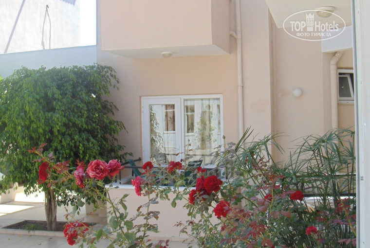 Территория отеля небольшая, достаточно чистая и ухоженная (кусты роз, мандариновые деревья).