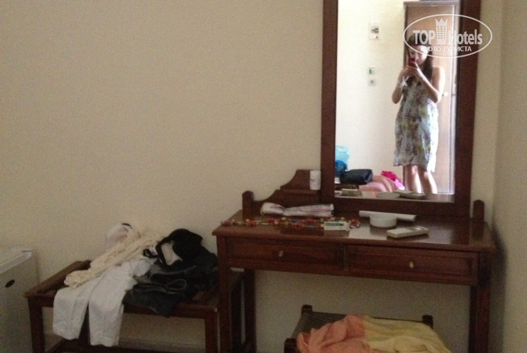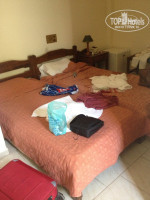 Ехали мы в самый сезон,и поэтому ,вместо обещанного double нас заселили в макроскопический twin.Номер нам достался очень маленький,мы часто бились о кровати.Мебель не новая,но к ней претензий вроде бы нет.Но такого маленького номера на двоих я не видела еще нигде.Чудесна система энергоснабжения-холодильник работает только тогда,когда вы дома.То есть,считается,очевидно,что в другое время охлаждать еду не нужно.Но не на тех напали!Мой молодой человек быстро соорудил из бумаги приспособление,которое позволяло держать его включенным.Постельное белье местами было с приличными дырами,странно,что за такие деньги с туристов в самый сезон они не могут его заменить.Холодильник был пуст(и хорошо),мини-бар за из бешеные деньги нам не нужен.Ванная комната состояла из кафельного углубления и шторки,то есть не душевой кабины,как вы могли сначала подумать.Любителям горячего душа советую не выбирать данный отель-вода здесь становится тепленькой только к вечеру,когда нагреется, а до этого времени делайте что хотите.Косметический ремонт здесь проводился несколько лет назад,и это заметно,так скажем.Голые стены без ничего,мебель-вот и все убранство номера.Скажу еще ,что у нас был чудесный балкончик метр на метр,и это однозначно скрашивало нам жизнь .Стеклопакеты у них стоят так себе,бешеный крик цикад мы слышали постоянно,но спать это не мешало.