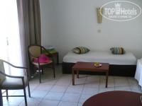 Отель понравился сразу, хоть и с размещением получилось не удобно для нас. Размещение в номер по правилам отеля в 14:00, а мы прибыли в 9:00 утра. Нам предложили оставить вещи в холле. Так и сделали, вещи оставили и пошли на пляж. Пляж муниципальный, но достаточно чистый. Идти до него 3 минуты. Лежаки и зонты платные по 2,5 евро за зонт и лежак. Прямо напротив пляжа находятся газоны с лежаками другого отеля. Там мы и разместились бесплатно и под пальмами) Никто нас не прогнал, потому спокойно просидели там до 12:00. В 12:00 нам дали браслетики и мы смогли пообедать. В 13:30 дали номер. Снизила бал за размещение только из-за этого. Номер у нас был отличный. На втором этаже небольшого коттеджа. Студия со всеми кухонными принадлежностями (посуда и кухонная техника вплоть до тостерницы и кофеварки), одна спальня, санузел и балкон-терасса. Мебель относительно новая, все чисто и аккуратно. Дети спали в студии на 2х софах, мы в спальне.