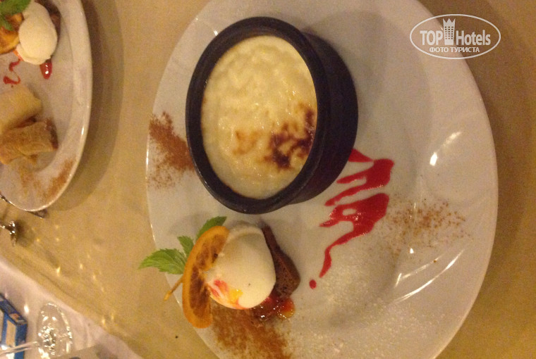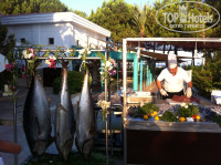 Основной ресторан - еды много... Возьмите за правило - кушать как дома - один вид горячего и один гарнир за один прием пищи, и тогда, вам будет казаться, что за время отпуска вы не перепробовали и половины блюд ресторана. Зелень и овощи в чистом виде - всегда свежие, сам можешь сделать себе салат, рядом с зеленью стоит витрина с различными заправками. Рай для тех, кто любит кабачки и баклажаны - всегда и в большом количестве и в разных видах. Нам очень понравились фаршированные мясом помидоры и перцы, а также запеченые перцы... При главном входе в ресторан на витрине есть котлетки из говядины (каждый день на ужин), они похожи на люля-кебаб, их готовят на углях, очеень вкусные. на обед и ужин всегда был различный выбор блюд из говядины и курицы, иногда была баранина. с фруктами нам не повезло - были зеленые, недоспевшие, покупали на улице - там вкуснее и черешня и персики.
