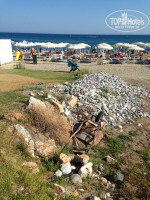 Пляж песчано- галечный, море необычайной красоты, теплое, прозрачное, лазурное и плавают рыбки, НО это заслуга природы, а вот заслуга ОТЕЛЯ это полотенца на половинку лежака (который ужасный), которое меняют раз в 4 дня, если не гаркнешь на рецепшене, и за которое нужно заплатить залог господа 10 евро/полотенце, которые здесь вороют. У нас украли и у мкня на глазах чуть не украли у другого человека. Есть подозрение, что многие ходят в туалет в бедное море, так как я видела лично как мамы деток сажают попой в песок, потому что Туалета нормального на территории пляжа НЕ ИМЕЕТСЯ, есть толчек, огражденный пластиком белым, без крыши, в котором забивается сами понимаете что и какой это несет запах в жару, душ старый, с облупленной краской и очень слабый, в общем общественный пляж на окраине Одессы привет.