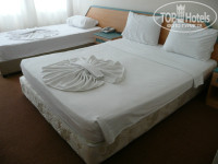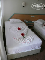 Номер у нас был стандартный, на 3-ем этаже, небольшой, но уютный, вид с номера был на горы, площадку для анимации и кафе. Зайдя в номер, нас ожидал сюрприз - из полотенец для нас были сделаны лебеди и посыпаны лепестками роз, украшены цветами. Очень было приятно, спасибо, что делаете такие сюрпризы для гостей, видимо знали, что мы молодожены :)