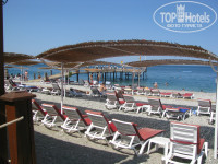 Пляж галечный находится через дорогу от отеля в 5 минутах ходьбы. Дорога на пляж мимо прудика, в котором плавают черепашки, есть утки и гуси. Очень живописно! Пляж чистый, ухоженный, есть пирс . Шезлонгов и матрасов много, всем хватало.