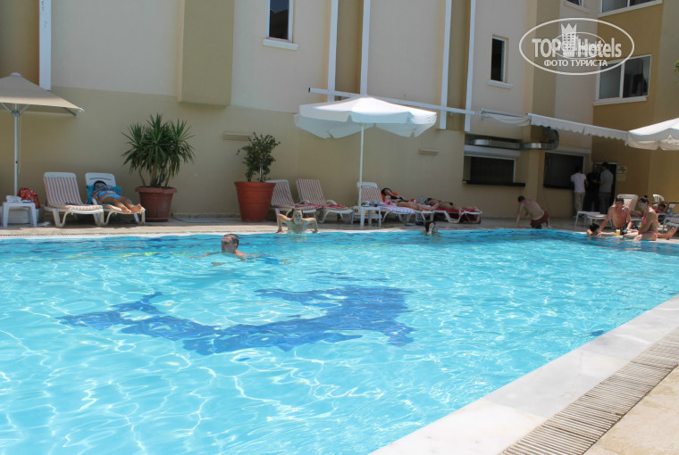 Приехали в отель 17.07.2013 поздно вечером,на ужин не успели.Разместили сразу,без ожидания.Номер дали хороший,на 6 этаже.По номеру претензий нет.Хорошо что сам отель находится не на главной улице,а рядом.Я и моя подруга пошли прогуляться,посмотреть.После дороги были усталые,но когда всё увидели,были довольны.На след день завтрак проспали,т.к высыпались) В общем.Еда хорошая! Фрукты,овощи,мясо,рыба,сладости сколько хочешь! Захочешь-всё не съешь!:) бармен очень милый,хорошо разговаривает по русски.Персонал очень приятный,вежливый,никто не пристаёт! Приятно находиться.Море очень близко,2 минуты и ты на пляже!) правда место мы занимали с утра,потому что лежаков на всех не хватает.Если места не было,иди в бассейн и развлекайся там!)) Про бар-стрит. Мы с подругой пошли первый раз днём,пешком-не нашли.А так каждый вечер приезжают менеджеры с клуба Арена,Бич-клаб,вас забирает их автобус-бесплатно! Вы заходите в клуб,без очереди,т.к.вы с менеджером.Вход везде бесплатный,правда напитки дорогова-то,ну это в принципе во всех хороших клубах так.Лично мы первый раз прошлись по всем клубам и остановились на Арене!) Постоянно туда ходили,зависали до утра.Обратный автобус в 3 ночи,тоже бесплатно.Если опоздаете,либо пешком,либо такси. Всё уточнять лучше у тех,кто вас привёз. Пешком до бар стрита минут 40,если бежать-быстрее)) долмушки ходят до часу ночи.Если не успели на автобус от клуба или захотели обратно в отель,сели и уехали) проезд стоит 2 лиры. Деньги лучше сразу перевести в Change office! он рядом с отелем,дорогу перейдёте и налево. В долларах,будете переплачивать,т.к.все цены у них в лирах. Рассказывать можно много и долго))) нам всё понравилось,до сих пор хочется обратно)