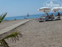 До пляжа около 200-300 м. Правда нужно выйдя из отеля перейти через дорогу, но это нисколько нам не испортило впечатления и я считаю, что это вообще не проблема. Кстати, до пляжа (хоть и 200 м) ездила маленькая тележечка - багги. Видно для ленивых. :) Пляж песочный, есть кафешка, лежаки, волейбольная площадка. Аниматоры ходили предлагали разные игры и т.д.