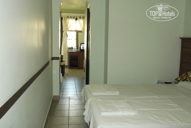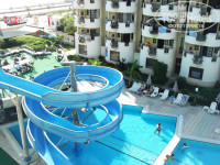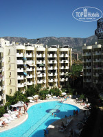 По пути в отель заезжали в турецкое кафе, там можно было перекусить, попить кофе, затем продолжили путь. В 9 с лишним мы были уже в отеле, по трансферу мы оказались последними, нам сразу же одели браслетики и отправили завтракать, после прогулялись и вернулись на ресепшен, там нам было положено ждать до 14:00 т.к. заселение по регламенту. Я в принципе знала, что "угостив" денежкой можно весьма ускорить процесс заселения, но так как я не сильна в коррупции, решила задать наводящий вопрос "А побыстрее не как ни получится?", и тут мне предложили (совершенно официально), доплатить 20$ за заселение в номер сьют, и объяснили что у нас забронирован номер стандарт, а стандарты все на первом этаже (зайти в них можно прямо через балкон), и это стандартно 1 комната с удобствами, а номер сьют - это спальня отдельно от маленько гостиной комнатки, с телевизорам, диванчиком и креслом. И того заселили нас в течении 10 минут, чемоданы нам поднял работник отеля, показал нам номер, номер классный, и каково же было мое удивление, что абсолютно у ВСЕХ номеров вид на море и бассейн. Лифт есть, но останавливается он между этажей, поэтому приходится либо спускаться на полпролета, либо подниматься. В номере есть все необходимое: фен, кандишн, холодильник, шкаф, сейф (платный), ванные принадлежности, сантехника в норме. Убираются постоянно и хорошо. В общем размещение 5+!!!