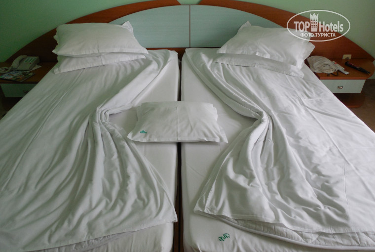 Номера. Тут действительно придраться трудно! Очень хорошо все! Просторные, чистые, убираются исправно (каждый день дают гель для душа и шампунь, можно не тащить с собой огромные "бутыли"), фен в номере, меняют полотенца каждый день тоже, и раз в 2 дня меняют белье. Русских каналов у телевизора целых 4(неужели вам мало?! можно подумать, телевизор приехали смотреть). Что касается, вида на море и вида на парк….(овку). Если вам нужен покой, ни в коем случае не берите 1 этаж. Вы будете жить как в Доме-2. Балкон выходит прямо на бассейн, даже выйти спокойно нет возможности. Если берете вид на море, будьте уверены, что вам дадут как минимум 5 этаж(а всего 7) и в центре. Иначе из-за деревьев вам и не видно ничего будет. У нас был "вид на парк", а точнее кхм парковку. Но ничего, зато тихо было, потому что окна с видом на море, выходят больше не на море, а на торговые площадки и к ним прилегающие дискотеки. Не буду врать, но мы были рады, что не взяли вид на море, потому что даже до нас, тем кто живет сзади, доносились вопли и пляски с дискотек.