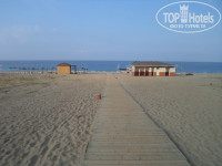 Пляж откровенно разочаровал, хотя по утрам его старательно убирали. Оставил впечатление большой пустыни, на окраине которой периодически сжигали пакеты с убранным мусором. Дощатый настил могли бы сделать поближе к морю, так как до моря далеко идти по раскалённому песку. Море было неспокойным, что осложняло вход и особенно выход из него.