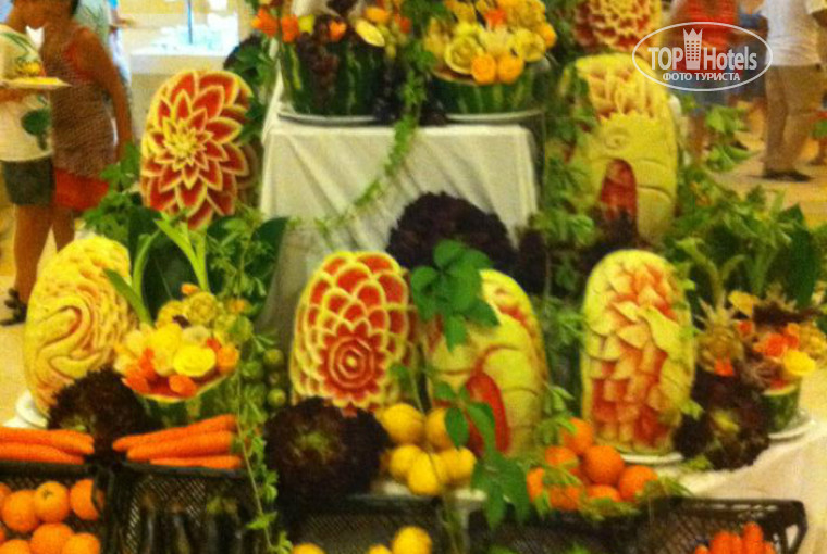 Большая ухоженная территория, с плодоносными фруктовыми деревьями,больше приспособлена для бунгал но не для прогулок. Пляж чистый, лежаки заняты абсолютно все с 7-8 утра и до конца дня. В ресторанах народу уйма, кормят правда, хорошо, не сказать, что балуют разнообразием, курицы конечно перебор, под конец отпуска хотелось кукарекать))))) Но фруктов, сладостей, маринадов и салатов просто огромное изобилие!