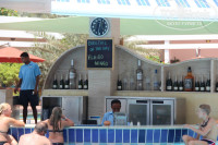 Между гостиницей и пляжем два бассейна. Справа детский, с перепадом глубин от 20 см до 60 см. Слева взрослый бассейн, перепад глубин от 40 см до 2 м. Сбоку к взрослому бассейну примыкает бар. Это удобно, но в тоже время, мне кажется, бар можно было поставить отдельно от бассейна. Вокруг в два ряда стоят лежаки с зонтиками. Вода в бассейнах приятная, охлаждает. Рядом комната для переодевания, туалет, душ.