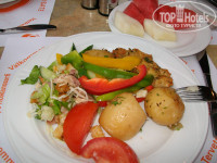 5. ПИТАНИЕ. Мы брали полупансион (завтрак и ужин). Еда в гостинице всегда вкусная и разнообразная. Каждый найдёт себе что-то по душе. На завтраках выбор просто огромный! яичница, омлеты, несколько видов колбасы, сыра, сосисок, вкусный бекон, йогурты, мюсли-хлопья, можно самим поджарить себе тосты, несколько видов джема, булочки, кексы. Стоит кофейный автомат со множеством видов кофе, можно просто заварить чай, а также есть автомат с соком (на завтраке напитки бесплатные, и все сами себе их наливают). Ужин каждый день разный: каждый день кухня разных народов мира (итальянская, мексиканская, кипрская, восточная, международная и барбекю). И на завтрак, и на ужин всегда были фрукты, особенно радовало наличие арбуза, а также на ужине всегда были различные десерты. Ко всем блюдам кроме сладкого есть таблички с подписями на английском. Если что-то непонятно (например, что за сладости лежат на блюдах) всегда можно спросить даже у поваров, которые периодически выходят в зал – все с удовольствием ответят на Ваши вопросы. Официанты вовремя убирают использованную посуду со столов. Один раз мы меняли ужин на обед. Всё решается прямо на месте. И ещё, если, например, рано утром уезжаете из отеля, можно заранее заказать завтрак с собой (breakfast box). Делать это надо накануне до 18:00 на ресепшн, а получить его можно во время ужина. В breakfast box входят булочки, кексы, масло и нектарина.