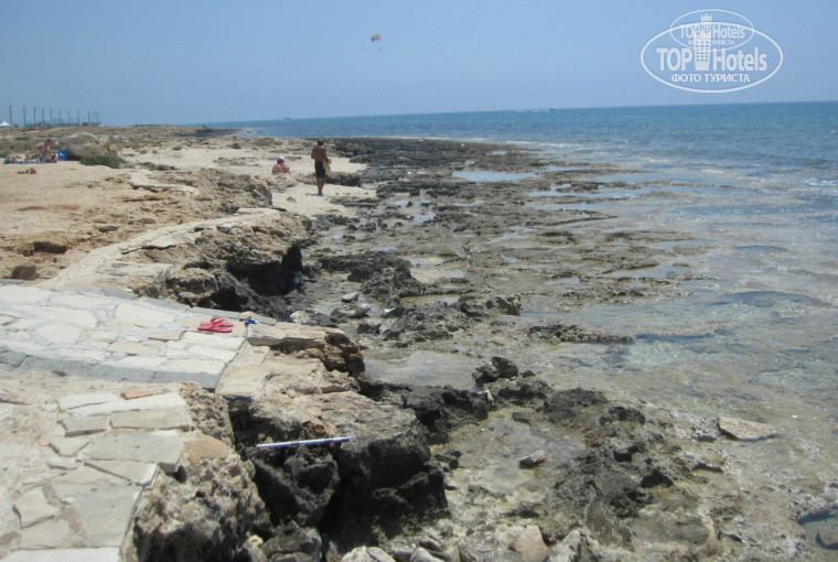 Отель делится на 2 части: одна с выходом на парковку, др на бассейн. Территория отеля полностью голая с засушливой землей. И уж конечно никакой первой береговой там нет. До моря от отеля идти минут 7, но спуститься с берега невозможно, везде осколочные камни. Если даже вообразить себя альпинистом и спуститься, то поплавать все равно не удастся. воды по щиколотку, скользкие камни с дырами, куда может провалиться нога. И так около 10 м от берега до глубины. В итоге мы ходили купаться на соседний пляж, до него мин 30 ходьбы. 2 пляжа, с двух сторон от отеля, до каждого не менее 30 мин. пешком. Или ехать на автобусе до Нисси бич, тоже мин. 20, но уже езды.