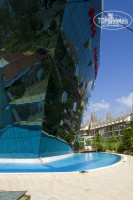 4. Территория. Она сравнительно небольшая. Огромный бассейн с горками. Дети наши и местные от горок в восторге). Зелёная территория перед амфитеатром. С бассейна шикарный вид на горы. Лежаков вокруг бассейна хватает всем. В цокольном этаже здания есть сауна, тренажёрный зал, хамам, бассейн с холодной водой. Всё бесплатно)
