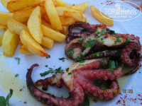 Кухня: Питалась в ресторане Рафаэль - разрекламирован он не зря,там действительно вкуснее всего и официанты не забывают о клиенте на протяжении всей трапезы, в отличии от других таверн!Очень вкусная картошка( фри,запечёная-всякая), лук,королевские креветки в сливочном соусе с рисом-шедевр,клефтико-обязательно попробуйте,осьминоги,кальмары на гриле,говядина со сливками и черносливом!!! И конечно же свежевыжатые соки(они везде) -я подсела на морковный-вкуснятина!