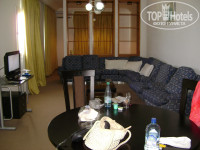 Рассление- не раньше часа дня,макисмум в два- денег давать бесполезно. Так что мы сходили на завтрак ,переоделись на первом этаже у ресепшена в купальники оставили чемоданы на видном для них месте и ушли загарать. В 13-30 атаковав ресепшене мы таки получили ключи. Скажу сразу номер меняли 3 раза. Итак про номера-они ни чем не лучше и не хуже чем в Турции,Египте . В некоторых ванна,в некоторых душ со шторкой,весьма малогабаритный для людей крупной комплекции и шторка не достает до пола. Сантехника исправна. Когда перегорела лампочка в душе- горничный сразу же кинулся ее менять. Кондей центральный,но работает тихо. НООООО! Имейте в виду - да все номера с видом на море кроме двух-они выходят на центральную аллею со стороны ворот куда подъезжают автобусыНо если вы пожилые люди или с маленьким детьми то сразу отказывайтесь от номеров с цифрой 7 в начале 701-728 ,301-313 ну и соответственно101-113,201-213-они выходят окнами на площадку для анимации,заснуть до 11 вечера невозможно,так же к номерам 310-313 и 210-213,101-113 -выходят окнами на кондей из кухни- всегда будете знать что будет на завтрак обед и ужин,и обилие мух,так что просите все что угодно только не их, а из номеров например с цифрами 340-350,,240-250,анимэ из соседнего отеля орет до потери сознания. А в номере 722-723- видимо в концдее кто-то сдох и шмон тухлятиной стоит такой что ......... короче нам поменяли его на номер над кухней с мухами ))))