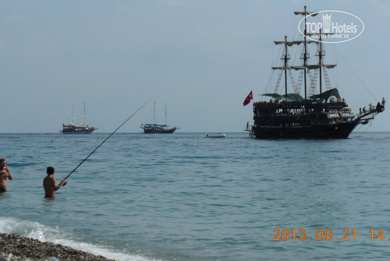 Пляж, конечно, маленький. Но у соседних отелей все тоже самое, что поделаешь - берег не резиновый! Мы ходили на море два раза - утром после завтрака, и вечером, около 5 часов. Утром лежаки всегда заняты, даже как-то душно, народу много. Мы ходили на дикий пляж (метров 20-50 налево). Там нет лежаков и зонтиков, но народу значительно меньше, галька чище. Рядом останавливалась пара с грудничком - просто ставили свой зонт, и все проблемы! Вечером свободные шезлонги находили всегда, ныряли с пирса, наслаждались закатом. В море заходили без тапочек, но это кому как удобно.