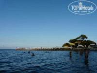 Территория отеля большая, красивая,много зелени,пляжи на выбор-песок-галька, понтон и галечный.Вода очень чистая-прозрачная, никакого мусора не плавало.Лежаки начинают занимать в 6.30, к обеду уже есть свободные.Мы на пляже не валялись,температура воздуха была 36-40 C ,купались и шли в тенек. Очень понравились качели, они расположены между бассейном и спа-салоном,их всего 5 шт -занимали около 8.00, они с навесом и всегда тенек , там и спал ребенок дневной сон весь отдых.На территории много фруктовых деревьев-апельсиновые, лаймы, оливковые. Бассейн большой, но холодный в первой половине дня,разная глубина от 20 см и далее- удобно с детьми, детские горки на любой возраст-для самых маленьких возле корабля в детском бассейне.Природа вокруг очень красивая-из-за нее и выбрали отель среди равных по цене.