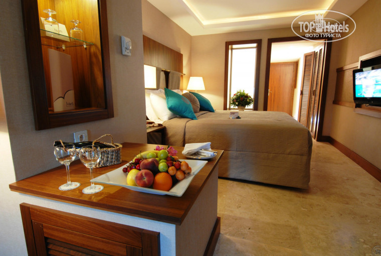 Мы жили в номере как на прикрепленном у меня фото. Там где столик с фруктами еще пара ступенек вниз, там как зона отдыха с диваном и выход на балкон.