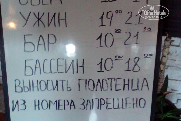 1. на стойке ресепшена - лысый, старый, хромой вася и молодой, которые делают вид, что ничего не понимают и только кивают головой - разговаривать и решать с ними вопросы бес толку. Сразу к директору или звонить гиду - туроператору. Постоянно как проходишь через фойе - куча народу всех по полдня заселяют, все ругаются и недовольны. Один плюс в этом месте wi-fi бесплатно пароль - more2010 вроде. (но только в фойе)))))) Вечно поперек главного входа стоит бмв дирика белая - неудобства слегка. Но нам повезло заселили быстро, но номер - у бабушки в колхозе чище и приятнее.
