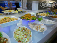5. Ресторан. Три зала - один в помещении (через перегородки), другой - на улице (большой), и еще зал на улице (меньше) со стороны бассейна . Мы всегда находили столик в ресторане в помещении, при этом никогда не стояли под дверью и не ждали когда же откроют ресторан. В плане еды претензий нет . Полно зелени-помидоров-огурцов. Каждый день были помидоры черри, кольца кальмара, креветки. Очень приличная жареная рыба (не костлявая), тушеная говядина, телятина, индейка. Курица в любом исполнении. На гарнир большой выбор макарон, картофель (фри, пюре, по-деревенски), рис, тушеные овощи. За десять дней два раза попали на суши. Сладкий стол разнообразен. Из фруктов были арбузы, дыни, апельсины, мандарины, нектарины, бананы, виноград, сливы. Кушать можно целый день. В баре на пляже готовят вкусную пиццу. В снек баре амфитеатра готовят печеную картошку с разными начинками. Есть бар в аквапарке и ресторан рядом, где тоже можно поесть не ходя в главный ресторан. До пяти вечера работает кофейня. Там очень большой выбор сладостей, мороженое, а также варят в турках на песке кофе. Голодными никогда не оставались.