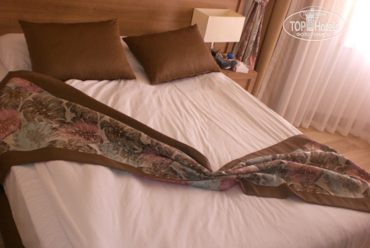 Номер нас очень порадовал, мы оплачивали обычный стандарт, а получили фэмэли 3-х комнатный в главном корпусе 2 этаж, без всяких доплат и просьб. Светло, чисто уютно, все в рабочем состоянии. Полотенец было обычно даже больше, чем нас(нас было трое), четыре, иногда пять, меняли каждый день. Правда, постель поменяли за 7 дней один раз. Тапочки, шампуни-гели- шапочки в наличии. Окна на бассейн и на дорогу. Был виден даже кусочек моря за отелем Дельфин. Фен, сейф, сантехника - все новое, рабочее. Бар пополняли каждый день безалкогольными напитками.