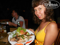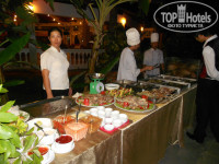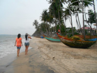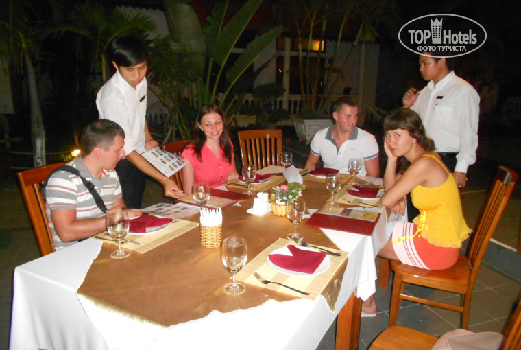 Ездили втроем-я,взрослая дочь и ее подруга.Честно признаюсь-боялась лететь,так как думала,что не перенесу такой лолгий трансфер. Дочь уговорила,выбирали отель по отзывам и не жалеем!Перелет из Москвы и обратно,а также дорогу до отеля перенесли нормально.За это спасибо компании Трансаэро и Библиоглобусу за комфортные самолеты и автобусы! В отеле по приезду разместили всех очень быстро,не смотря на то,что нас было много.У нас с дочерью был бунгало номер 701,у подруги 705 все с видом на бассейн.Похоже,что наши номера были самыми простенькими в отеле,но нас они вполне устраивали. Чисто,уютно,со всем необходимым.Вода горячая без перебоев,телевизор жк,чайник электр.,кондиционер-все работало. Напротив номера-бассейн,справа от нас ресторан,за ним сразу пляж-очень удобное расположение! Удивила ежедневная уборка с мытьем полов и со сменой постельного белья и полотенец(в Турции в 5*не всегда такое бывает).Чаевые оставляли постоянно в качестве благодарности за чистоту по 1 доллару и шоколадке. Персонал отеля очень дружелюбный,есть русскоговорящая девушка Тху,остальные понимают английский. Утром завтракали в 7-30 в ресторане отеля,где нас всегда встречали и провожали с улыбками.Меню вполне нормальное,можно выбрать по вкусу,фруктов маловато:арбуз,сердце дракона,ананас и клубника(не вкусная),но мы фрукты всегда покупали в магазинчиках рядом с отелем. Очень понравилась территория отеля -зеленая,уютная и чистая! Пройтись по ней-одно удовольствие! Пляж тоже замечательный! Шезлонги не занимали,всегда были свободные,а когда не хватило,то охранник на пляже принес нам из бассейна сам.Полотенца пляжные менялись ежедневно без проблем,стелили их на шезлонги и отсутствие матрасов не замечали!Море теплое-претеплое! Вода очень соленая!До обеда никаких волн,утром рано-полный штиль! На пляже можно сделать массаж за 5долларов (нам делали целый час На-на и Са-ша)-очень понравился!Можно купить горячую кукурузу за 1доллар-вкусная!Можно купить изделия из жемчуга совсем недорогие,выпить сок кокоса за 1 доллар(при тебе срезают верх кокоса и вставляют трубочку)-очень освежает в жару!Можно покататься на водном мотоцикле за 20долларов 30 минут(меньше-дешевле).Можно заняться виндсерфингом и кайтсерфингом,есть школа для начинающих.В общем все здорово! Когда после шторма на пляж выбрасывало мусор,то охранники быстро все убирали.Наш пляж был самым чистым по сравнению с соседними отелями,мы убедились в этом прогуливаясь по берегу. Отдельно хочется написать про бассейн.Мы плавали там после обеда и часто по вечерам перед сном. Такой чистый,освежающий,красивый бассейн.Есть джакузи,включают по первой просьбе и наслаждайся! Так что с утра на море,а после обеда и сна-в бассейн! Шума возле бассейна не было даже по вечерам,однажды мы собрались вечером компанией возле бассейна и так хорошо сидели,что начали петь русские песни,компания напротив нас тоже поддержала нас,пришел охранник и показав на часы приложил палец к губам.Мы все поняли и уже не шумели! Теперь о кафешках куда мы ходили обедать и ужинать.Мы побывали почти во всех ближних.В Ареке напротив отеля понравился суп Лао и шашлыки из крокодила,В Белоснежке приятный хозяин Дима-вьетнамец,говорящий по-русски и вкусные блюда,но больше всех нам нравилось ходить в Чайку к Володе и его жене Инне. У них можно поесть не только вьетна