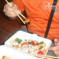 Даже не знаю, что такого про него написать - все на уровне трешки - мебель типа икеевской, маленький холодильник, ТВ с тремя русскими каналами, душевая, унитаз, раковина, все рабочее в нормальном состоянии. Вид с балкона на ихний лесок, в котором обитала масса птичек судя по шуму. Живности в номере не обнаруживали, комары не доставали, т.к. с собой взяли фумитокс в розетку. К обслуги претензий не было, все убирали чисто, ничего не сперли. В отеле были в основном русские, братья славяне, немцы... Не шумно, никто не доставал... Завтраки были на 3 с плюсом. Сам ресторан (это громко сказано), это скорее кафешка с пластмассовыми столиками под застекленным навесом. Но вот, честно - это простые скромные завтраки: колбаса, рис, что то типа макарон, огурцы, помидоры, приправы, напитки, джемы, фрукты... ничего особенного, но мне этого вполне хватало, чтобы нормально позавтракать и не проголодаться до обеда и даже полдника. А на ужин, я как правило брал мясо, курицу или рыбу в близлежащих макашницах, это 100-150 батт с салатом и соусом, а пиво (Чанг 0.5л - 44 батт) в киосочке справа от отеля. Там торговал прикольный хромой мужичок с которым подружился, когда сам навернулся с мопеда и ходил с костылем:). Можно перейти на другую сторону или пройтись чуть дальше от отеля. Много забегаловок, ни разу не траванулись. Частенько брал суши-бокс на вечернем рынке около Джанг_Цейлонга, набор (как на фото) с разными там кальмарчиками-креветочками, обходился около 100-150 батт.