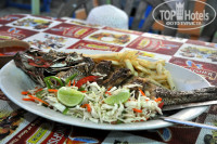 До моря идти пешком минут 5-7. Выходите их отеля и сразу налево, по тропинке, через дворик местных жителей, у которых стоит лавчонка с фруктами - можно по пути с моря у них купить связку банан сладких, или еще чего - все очень вкусно. При подходе к пляжу стоят таксисты - с ними можно договориться о поездке. К примеру, до Кольвы туда-обратно за 200рупий (это около 3,5usd или 100руб). Тут есть прокат велосипедов (400рупий/сутки), тут же и сувенирные палатки, где Саша вам любезно обменяет usd на рупий по курсу 62. Он может Вам сдачу долларами дать. Это хороший курс - можно менять. Выходите на пляж - слева шейк "Роза и братья". Мы там только и кушали. Роза приятная женщина, понимает по-русски. Готовят очень вкусно. С животом проблем не было. Рядом с шейком Розы есть другой шейк - там молодые ребята обслуживают. Еда у ребят уступает по качеству перед Розой. Единственный плюс у ребят - это слабенький wifi. Если вам нужен wifi - купите пиво у ребят и пользуйтесь wifi, но кушать рекомендую только у Розы или Альберта (по пути на пляж). По ценам на еду у Розы - к примеру, акула средняя 900рупий, морской окунь (вкуснее акулы) - 850-900рупий. Вполне на двоих поужинать выйдет 1200-1300 рупий. Одной рыбы хватит на двоих - она сытная. Еда не острая, Роза давно знает вкусы европейцев. Очень вкусные соусы к рыбе. Ну что Вам еще сказать - сходите один раз к Розе, а там поймете, о чем я вам говорил. Не пожалеете.