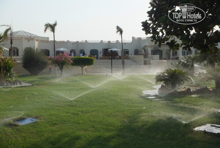 Территория отеля красивая, большая, зелёная, ухоженная (между отельной частью и пляжной есть неухоженная полоса, но нам она не доставляла эстетического неудовольствия), есть где погулять, что немаловажно, потому что это крайний отель в Хургаде и пойти вечером за территорию некуда. Правда, на дороге за пределами отеля шныряют многочисленные такси и, при жедании можно доехать до центра Хургады. Но это на любителя, поскольку в центре вы столкнётесь с навязчивыми местными продавцами, которые хватают вас мёртвой хваткой (я бывалый турист в Египте, поэтому спокойно к этому отношусь). На территории есть аптека, несколько магазинчиков с пляжными товарами, папирусами и прочей местной продукцией, небольшой зоопарк и лошадки (очень трогательные, восторг!).