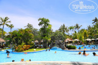Общее впечатление об отеле - хороший отель, построен традиционно, как и многие другие отели на Нуса Дуа, большая зеленая территория. Приехали мы вдвоем с дочкой (11 лет) в первом часу ночи, заселили очень быстро, в номере традиционно тарелка с фруктами. Я взял 4-х местный номер на первом этаже с выходом в бассейн. Номер состоит из двух смежных неразделенных помещений, своя терраса с лежаком, креслом, столиком. В номере к телевизору можно подключить флэшку или накопитель с фильмами, поэтому на Новый Год мы смотрели на телевизоре "Иронию судьбы".