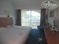 На "стойке регистрации", Ресепшн, мы быстро заполнили анкеты, причем я попросил номер желательно повыше, не люблю, когда кто-то над головой ходит. Так вот, мне не просто кивнули, а сделали пометочку на анкете и сказали, мол, сделают все, что в их силах. Девушку звали, кажется, Salma. Привезли нас часов в 10-11 утра. Рано по меркам заселения. Международные стандарты заселения все-таки с 14:00, тут не поспоришь. Пришлось посидеть в прохладном холле, побродить посмотреть окрестности, пообедать опять же :) Ну и наконец к 13:00 нас заселили. Номер - замечательный. Как на фото. Самый верхний уровень, третий по счету от "носа самолета". Вид - на всё побережье Лары и Кунду: от рядом стоящего Лимака до "Кремля" ( Kremlin Palace). Просто супер! Я не ожидал, что персонал НАСТОЛЬКО сделает все, что в их силах. Т.к. у нас был оплачен всего лишь обычный Land/Garden View. СПАСИБО!