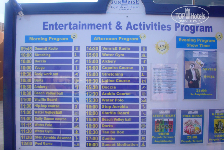 В 21:00 каждый день шоу в амфитеатре, в 22:00 живая музыка или лотерея на террасе.