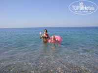 Вход в море глубоко, песок-галька не крупная, пляж широкий. На берегу есть ресторан.