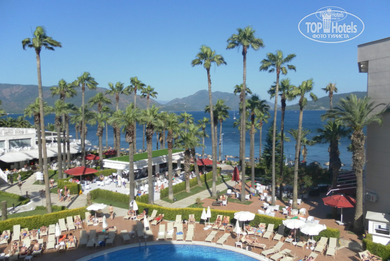 Отдыхала с мамой. Приехали вечером, при заселении возникли какие то проблемы но знание англ.яз и 5$ в паспорте сразу все исправили) персонал по русски не говорит. Отель очень понравился, чистый хороший номер, убирали очень хорошо, еда супер!! есть с чем сравнивать! внутри отеля как в музее! территория небольшая, но классная. Целый день валялись у моря на пирсе, там немного мест, надо занимать рано утром, редко плавали в бассейне. Вечером пару раз ходила на диско, аниматоры устраивают интересное шоу, минус что алкоголь на дискотеке платный, но друзья Голландцы научили брать алкоголь в баре и приносить туда)) из русских встретила только одну девушку, были украинцы но какие то дикие( в основном голландцы, немцы и бельгийцы с ними я и тусила. Обязательно в Мармарисе надо посетить Bar street все веселье там! Ездили на экскурсию в Памуккале который находится в древнем городе Иераполис очень красиво и необычно, но больше всего удивил бассейн Клеопатры в котором плаваешь в минералке)) просидели там наверно часа 2, не хотелось вылазить!!! Еще ездили на кораблике по Эгейским островам, красота! вода голубая голубая, как на картинке!