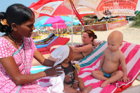 по приезду три дня был штиль,накупались вдоволь!!!заход в воду песок,полого, дно чистое,ребенок был в восторге!!!!! то и дело забегал все время в воду,собирал ракушечки...на 4-5 день начались волны,к вечеру они становились очень сильными и мы уходили купаться в бассейн. последние 2 дня перед отьездом море было такое,что в воду из-за волн невозможно было войти.но мы к тому времени уже накупались и довольствовались небольшими "окунаниями" в воду по пояс))) с утра весь берег изрыт норками крабов!для детей очень интересно будет понаблюдать за живностью)) ах да!!! собачки!!!они всюду))) если Греция славится кошками, то Гоа - собачками!!они спят практически под каждым лежаком, доставляя тем самым отдыхающим деткам необычайную радость. собачки ленивые, сонные, никого не трогают, еду не клянчат, а наоборот - отгоняют торговцев от туристов) вот такие вот они заботливые)))