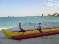 Пляж. О нем нужно писать отдельно, он просто супер, песочек беленький, очень много ракушек, мы насобирали целый пакет, привезли домой (из ОАЭ можно вывозить ракушки), вход в море идеальный, довольно плавный. Это неудивительно, ведь весь остров рукотворный, вид с пляжа на море и на побережье. Волн практически не было, думаю это обусловлено формой острова. Мы были в феврале, в море купаться было довольно прохладно, но несколько раз мы все таки залезли. Пляж очень длинный , полукругом, в левой части есть надувной комплекс с горками, лазилками, батутами, он подходит для детей постарше и взрослых, но будьте осторожны , мои дети на нем порезались о края материала, из которого он сшит, порезы , конечно, не глубокие, но неприятно. И вода рядом с ним мутноватая. В центре пляжа комплекс с катером, бананом и другими водными развлекухами,, купаться лучше всего на правой части пляжа.