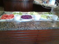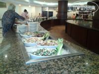 На территории отеля летают мухи, установлены желтые корзинки, но проблему они не решают. Завтрак ужин и обед в главной столовой на первом этаже. Будьте готовы на ужин дрэсскод вечерний элегантный. Шорты сланцы и майки алкоголички нельзя. Еда часть видоизменяется либо в какой-то день больше рыбы, или мясной день. Через день вкусное пюре. Были креветки но они их пережарили до горького вкуса. Помидоры попадались иногда слегка подгнившие. Суши тоже были но рис очень сухой. Овощей достаточно лишь капуста полита их сладким соусом на любителя. Фрукты не менялись: грэй апельсин яблоко банан груша и сладкий, финики. Странно везде пишут март сезон клубники и гуава, но ими украшали лишь тортики вырезая по кусочкам. Сама клубника мы покупали на вкус зеленая трава безвкусная хотя внешне большая и красивая. Соки разбавленные утром с мякотью. Был момент когда яблочный разбавили один к одному пить было неприятно. Спиртное ужасное пили в основном пиво. Вино пейте осторожно, многие чувствовали себя не очень по рассказам людей его пьющих. Импортный алкоголь дорогой и русских дурят иногда приносят ихний вместо купленного импортного. Сладости разные пончики тортики крема и тд. В общем выбор сладкого достаточно разнообразен. Очень понравился шашлык и утка. Во время процесса еды ходят официанты, но в первую очередь обращают внимание на немцев русские жаловались что забывают принести заказанный сок и тп либо игнорируют. нас вообще официант хотел прогнать со столика мы сели как обычно на улице за свободный, он подошел и говорит пересаживайтесь тут нельзя тут должно три сидеть, хотя соседи сидели на таких же столиках по парам немцы и к ним никто с претензиями не обращался, поскольку мы уже начали кушать место не меняли больше никто не беспокоил. Для галочки спрашивают все ли хорошо по 50 раз у иностранцев и по разу у русских. Русских узнают сразу по лицу. Вообще любезничают больше с иностранцами русских недолюбливают будьте готовы к этому и быстрее принести себе что-то самому. На выбор можно сходить один раз в ресторан. Мы пошли на крышу. Меню порционное ограниченное да и по вкусу все тоже что и внизу просто красиво оформлено. там можно покурить кальян 4 уе.