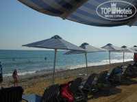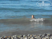 Пляж собственный, небольшой. Но всем хватало лежаков, хотя и были в конце июня. Здесь ранее в отзывах писали, что на пляже крупная галька. Действительно есть, но по ней никто и не ходил. Между лежаками дорожки, вход в море по мостику - сразу в песок. Плавали даже когда были большие волны, под ногами песок!!!