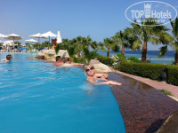 После обеда шли отдыхать к бассейнам. Места полотенцами не занимали(были ранее неприятные случаи) но всегда находили лежаки.Имеется ввиду бассейны теплый и с баром. На других вообще редко людей видели. Вода чистая - в теплом градусов 30, без подогрева 20, море 25(по ощущениям) Удобно что зонты возле бассейнов на роликах и тень настроить легко.Бар у бассейна так же работал очень качественно, никаких вопросов(мороженное просто класс!)).