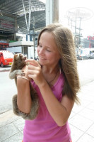 На второе утро проснулась от стрекота: своим присутствием порадовала крупная стрекозка, я поймала её и выпустила на улицу) Прогуливаясь, на одной из улочек встретили тайца с лемуром – погладить-поцеловать - подержать – это бесплатно, а за бесконечное количество фото просил 100 бат) Как пройти мимо?! Нафоткала дочку с героем "YouTube" , пообщались с владельцем на очень усеченном английском – он предложил нам подождать апреля, пока лемуриха разродится и купить детку… но за незаконный ввоз лемуров в нашей стране могут и срок дать!))