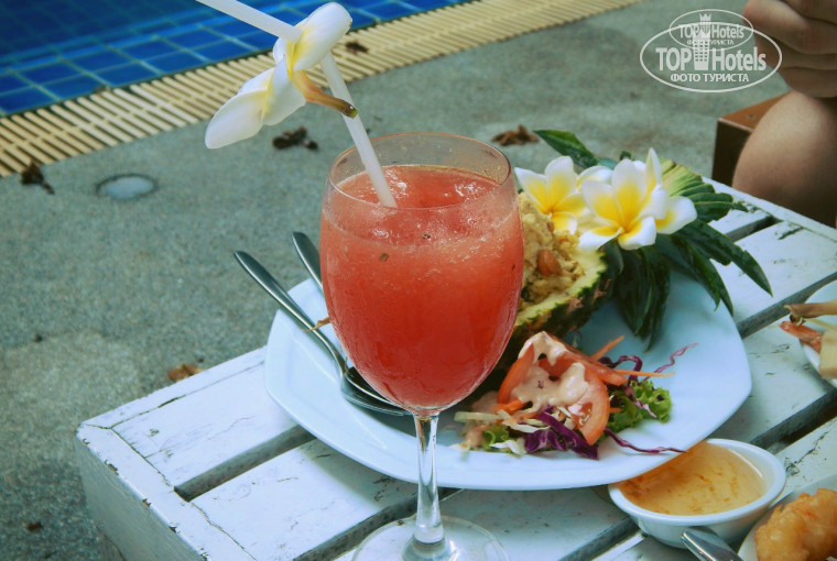 Во дворе бассейн, работает до полуночи. Можно посидеть за столиком, выпить,покушать и покупаться. растут орхидеи.