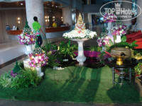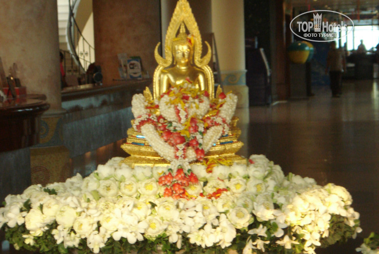 Конец моего отдыха выпал на начало сонгкрана. У входа в основной корпус отеля тайцы разместили красивую композицию из цветов и травы со статуей будды, рядом поставили чашу с водой и лепестками цветов. Периодически статуе поклонялись и поливали ее из половника.