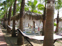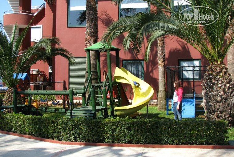 Территория не большая, компактная, зеленая. Продумано все очень грамотно, все на месте, все удобно. Территорию отеля условно можно поделить на 3 зоны: 1 – тихую зону. Большой тихий бассейн без анимации, просто для отдыха и загара. У бассейна свой бар. 2 – активную зону. Бассейн с тремя горками, работающими весь день, как мне показалось, большой бассейн с анимацией, здесь же входы в крытые бассейны, их 3 (детский 0,4 м, взрослый 1,40 м, и джакузи 1 м). И собственный бар с алкогольными коктейлями, соками, выпечкой, хот – догами и горячими тостами. По этим двум зонам ездят 2 тележечки, одна с прохладительными напитками, кстати, можно попросить ефес темный, или ефес лайт в бутылках. У них есть не только разливной. Вторая тележечка возит огурцы, яблоки и морковь в мисочках со льдом. Ты просишь, тебе дядя чистит например огурчик или морковь, ну или яблоко и подает. Приятно))) Ну и 3 зона – детская зона. Мини-клуб, детский туалет на улице (любовь моего ребенка),детская площадка, детский бассейн с 3 слониками – горками, детский бар с соками, молоком с бананом или с клубникой, и такими же огурцами и яблоками как на тележке, и конечно луна-парк (все как и в прошлых годах, бесплатно с 15.00 до 17.00).В луна-парке есть бар, «секрет» называется, вот в нем готовят вкуснейшие безалкогольные коктейли на основе свежих фруктов, сока и льда (клубника, банан, персик). Ну и завершает территорию улочка, которая тянется вдоль пляжа с едой. Мороженное, все так же бесплатно, молочные коктейли, лепешки с мясом, турецкие лепешки, шаурма и снек- бар.