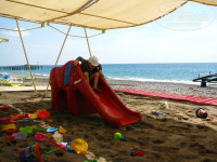 Вот тут конечно и подумаешь что написать. Пляж грамотно называется песчано – галечный. Да..песок на пляже, галька - вход в море. Были не в купательный сезон, вход был не принципиален, но как же русскому человеку не помочить то ножки. Мой вывод, при входе в воду только спец. тапочки. Вход сразу набирает глубину. Лежаков много, про домики – шале написан уже роман. Ничего не поменялось, все так же бесплатно, красиво и чисто. При нас сделали на берегу песочницу для детей под навесом. Просеивали песок от гальки. Огородили дорожками с четырех сторон, крытыми ковром. Поставили слона – горку, в самой песочнице в избытке совочков – ведер для лепки чего-угодно из песка. На пляже есть свой бар, там только чай – кофе, пиво и айран, но через 2 метра бар снек – бара, так что всего хватает.