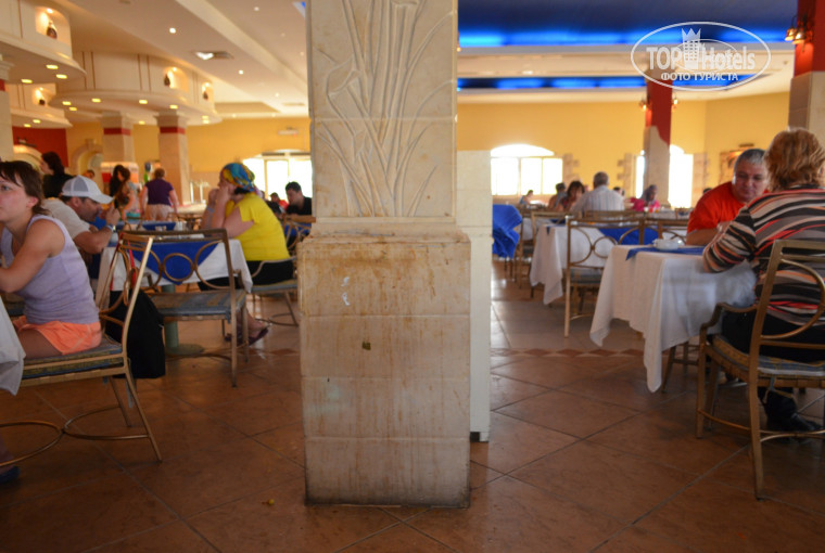 А теперь о главном)): сразу поразили очереди в столовой, она нескончаемая и за всем. Питание ни разу за все 14 дней не поменялось. Завтрак – из мясного только сосиски, огурцы, капуста, морковь и ВНИМАНИЕ!!!- никакого соуса, масла и пр. – т.е. есть овощи свежие – В СУХУЮ! Объясните – как? Морковь(каротин) например усваивается ТОЛЬКО с жирами, да и как натертую морковь с нашинкованной капустой можно есть без ничего? Оказывается можно. Ели. В обед ничего нового от завтрака, плюс соусы, помидоры в драку и с очередью еще большей (нам никогда не доставалось, даж не подходили, т.к. ребенок маленький и стоять у каждого блюда в такой ЖЕСТОКОЙ очереди просто нет возможности) В предыдущих отзывах написано – блюда заканчивались, но их подносили….Да, возможно. Но ведь не будешь ждать, когда принесут…А приходилось ждать людям. Быстро там ничего не делают. После покушавших столы не убираются. Тебе нужно подойти к грязным тарелкам, занять столик и и искать официанта, чтоб убрал и подал чистые приборы. Убиралось со столов все на пол тут жу.. Можете представить какой пол. Какие стены – смотрите на фото. И это в месте, называемом ГЛАВНЫЙ РЕСТОРАН, где приходилось принимать пищу…. Из фруктов только финики, дыня и апельсины. При чем дыни постоянно не хватало, т.е. тож в драку. Меня это зрелище просто унижало. Я находилась в неприятном настроении от увиденного ежедневно. Салаты сделаны из недоеденного от предыдущего приема пищи, рис каждый день, картофель, мясо – одно, но туда обязательно были добавлены либо картофель, либо цв. капуста, либо фасоль и пр., соуса столько, что казалось это суп))), люди выуживали и выцеживали мясо, это тож выглядело жалко…Ну что еще про еду? Да даже не хочется вспоминать. Мужчине, привыкшему хорошо покушать – будет голодно. Женщине, сидящей на диете – самое то- всегда капуста есть, морковь, неизменно рис. «Все включено» подразумевает алкоголь местный в обед и ужин. Мы его не пьем, так это видимо, было написано у нас на лбу. Ни разу – никто и не предложил из официантов. Т.е. также приходилось бы выпрашивать, либо ежедневно подавать. Кстати к последнему, там очень привыкли все и без долларов и шевелится не будут. Кто там писал за улыбки сделают, что хотите… Не знаю, видимо, у меня она некрасивая…. Теперь про дет. питание. Для ребенка – кроме риса(ежедневного) есть нечего, если Вы его не кормите конечно чем попало.(Но для меня это было неважно, т.к. мой еще маленький и исключая всяческие риски, я беру питание-баночки с мясом и пр. с собой, а также, как писала выше – грудь наше все.) Для меня важно другое – детское кресло. Люди!!! К нему даж дотронуться невозможно – настолько оно грязно-жирное. Ну хотя бы раз в неделю – надо делать генеральную уборку их…, ну хотя бы для детей….На фото также показываю насколько грязное детское место в детской зоне.. Это ужас. Чашек для кофе и чая постоянно нет. Нужно ждать, когда принесут. Грязь даже за чайными столами, хуже чем в самой грязной студенческой столовой в советское время ( а я уточню – мне 41 год). Вообщем, про питание закончу – все понятно, думаю – грязь, очереди, недовольные люди вокруг от этого же, хватающие в тарелки всего и побольше, что не хватает, коль посчастливилось, как буд-то они это едят в последний раз. Стыдно мне было находиться среди них, стыдно и унизительно.