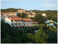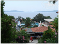 Добираться до отеля из Салоников пришлось часа 4. Автобус довез только до промежуточного отеля, что на втором пальце полуострова. Около часа сидя на чемоданах ждали авто. Претензия здесь скорее конечно к туроператору принимающей стороны, организующей трансфер до отеля. Вообщем со всеми прелестями перелета (Вылет из Москвы задержали на 5 часов...типа запасной самолет ждали) к вечеру получил долгожданный ключ от номера))). Естественно поселили хрен знает куда...вид замечательный с высоты птичьего полета конечно, но спускаться и подниматься пешком по жаре на такую высоту (самое верxнее бунгало...см фото) можно просто подохнуть. Но хочу заметить, персонал дружелюбный и за 20 евро спустит Вас на досягаемую для вашего здоровья высоту.