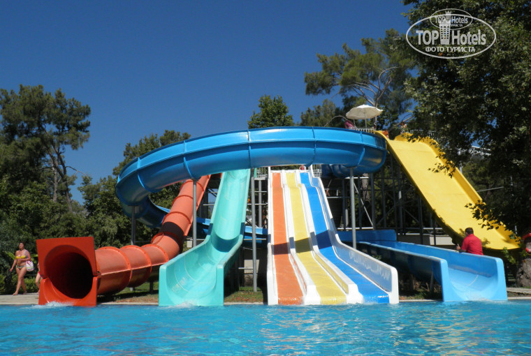 Минусы: поскольку окна выходят на бассейн, а каждый вечер возле бассейна караоке или громко играет музыка, и это продолжается часов до 12, то заснуть с открытым окном не предоставляется возможным. Да, и через закрытое окно тоже очень слышно. Минусом с моей точки зрения также является расположение аквапарка. У Вас не получится и поплавать в бассейне и прокатиться на горке. Нужно выбирать так как основной бассейн и аквапарк находятся в разных концах отеля. Если пойдешь на горки, то проплыть в том маленьком бассейне не удастся, нужно только кататься на горках. Полежать на шезлонге там тоже не получится поскольку их очень мало возле бассейна и они всегда заняты. Т.е. только прийти покататься и уйти. Это проблема, если в семье есть любитель водных горок, а кто-то это развлечение не очень любит, придется разделяться. Горки не предназначены для детей 4-8 лет на мой взгляд. Есть одна совсем для малышей в отдельном бассейне и пять очень "крутых" для подростков и взрослых. Мой пятилетний ребенок так и не решился проехаться, хотя в Ботанике за год до этого каталась на нескольких горках. Также дискомфорт доставляла такая удаленность от основного здания детского клуба. Нужно было специально отводить туда ребенка, а потом возвращаться к бассейну или морю. Если детки постарше, то конечно они уже бегали туда сами. Это проблема для родителей малышей опять же 4-6 лет на мой взгляд. Территория зеленая, но в большей степени в районе вил. Возле бассейна найти тень от дерева - это роскошь, только навесы.