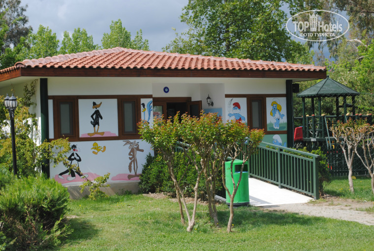 Территория очень зеленая и достаточно большая, с 2 бассейнами и детской площадкой. Есть сцена со зрительным залом на свежем воздухе. Все очень продумано. Рядом с бассейном - 2 горки, туалеты и душевые. Рядом с детской площадкой - дом для детских игр, где можно спрятаться от солнца или дождика.